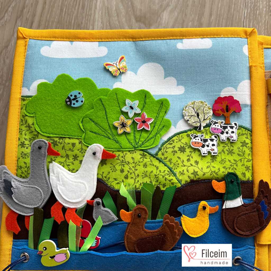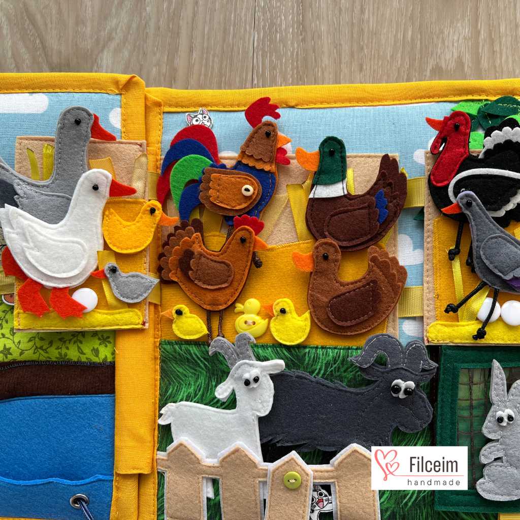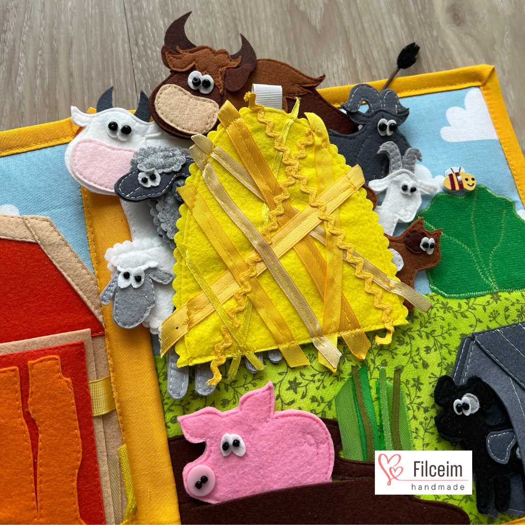 A Farm csendes könyv egy készségfejlesztő textil matatókönyv, amely a farm (tanya) életét mutatja be. A könyvben 23 filc állatot találsz, amelyek közül 8-an párban vannak és néhányuknak a kicsinye is fellelhető. A állatok kivehetők, mozgathatók, és szerepjátékra is alkalmasak. A könyvben megismerheted a kacsákat, libákat, pulykákat, kakast, tyúkot, lovakat, tehenet, bikát, birkákat, kecskéket, cicát, kutyát, és malacot.