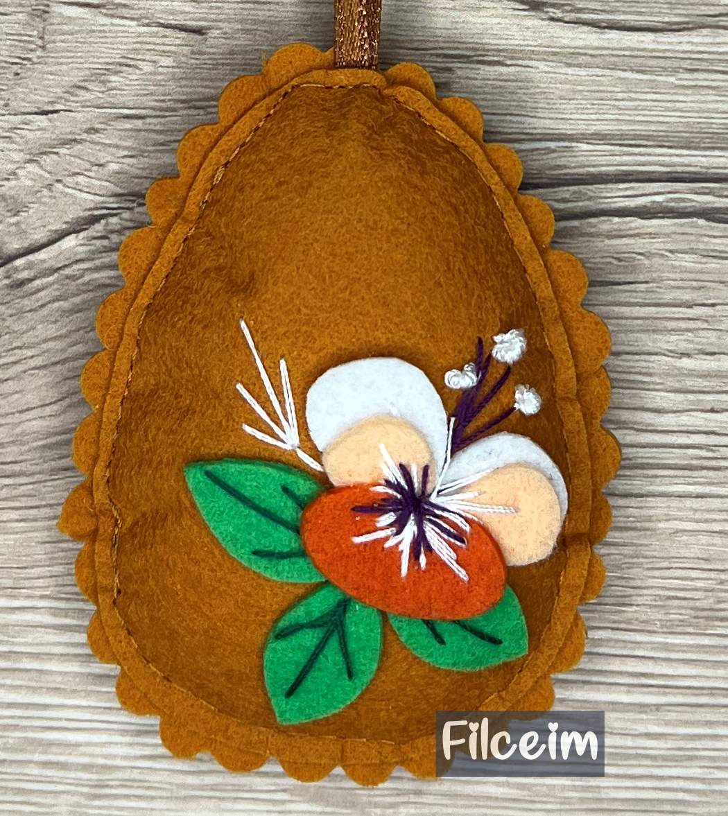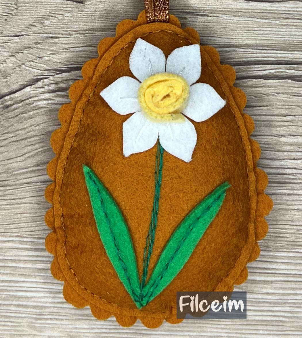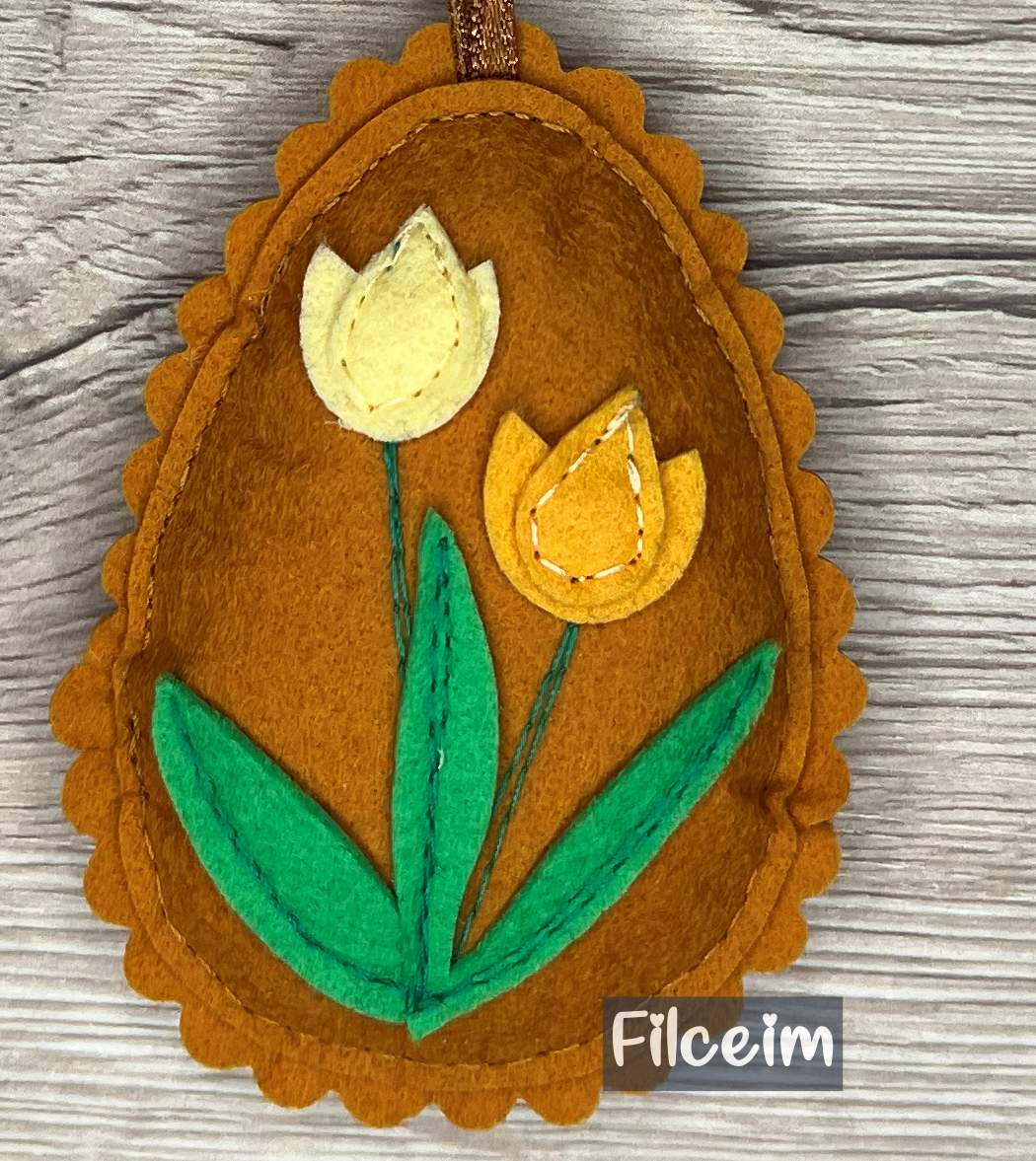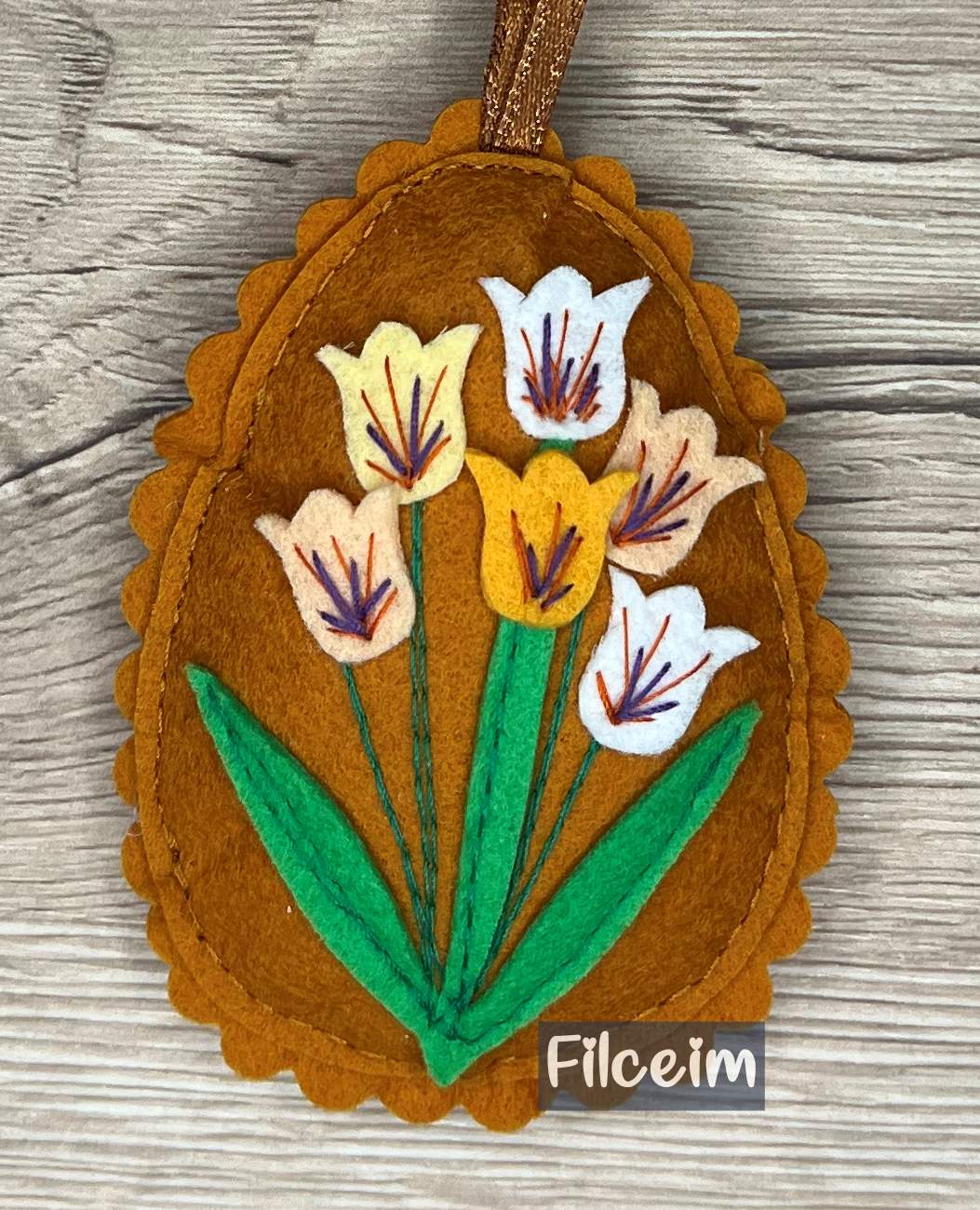 A tojáson lévő virág motívumok is filcből, egyedileg kézzel készültek gyöngyök, hímző fonalak és cérnák segítségével.