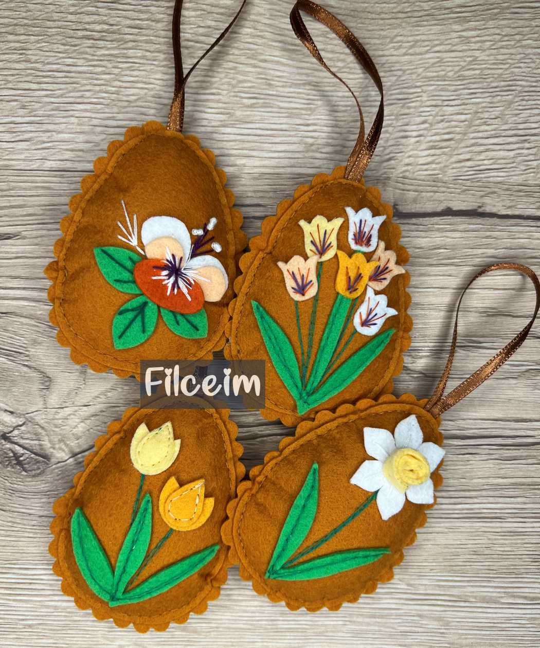 Kézműves termék, rendeltetése dísztárgy. Barna alapszínű 4 db-os filc húsvéti tojás szett.